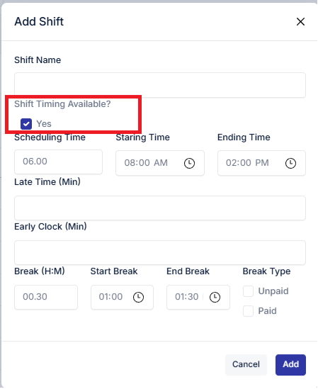 Enter break time and specify if the break is paid or unpaid (this will be connected to payroll or salary).