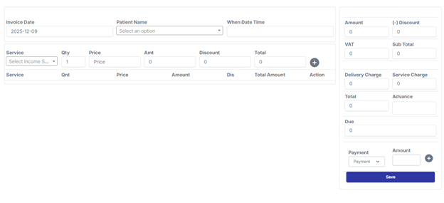 Input Date: Enter the invoice date. Select Patient Name: Choose the patient name from Patient > Patient List. Select Service Name: Select the service name from Setting > Account Setting > Subcategory. The price will auto-populate. If needed, you can change the price. Click the plus icon to save the service. You can add multiple services this way. Automatic Calculations: The system will automatically calculate the price and other details. Additional Charges: If the invoice has delivery or service charges, input these in the respective fields. Advance Amount: If the patient has an old advance, it will show in the advance field (Account > Advance > Advance Report). Payment Method: If the patient has paid the amount, select the payment method from Setting > Payment Method > Offline Payment Method. Input the paid amount. If there are multiple payment methods, click the plus icon and add them in the same way.