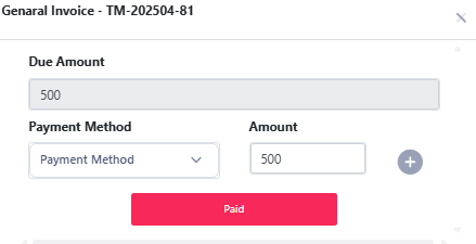 Pay: Click the pay icon to open a modal. Add the payment method and amount. If the due amount is 0, you can pay the invoice. Otherwise, the pay button will not be visible