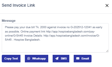 Send Link: Click the send link icon to open a modal. Click “Copy Link” to copy the link. This link allows the user to open the invoice online and pay the due amount.