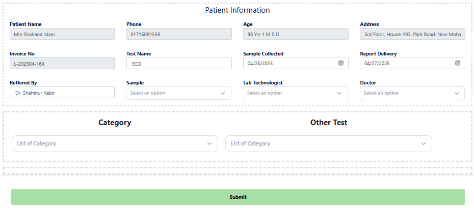 In this section, you can manage lab requests, add lab reports, and track the delivery status of lab reports.