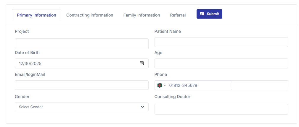 In the Patient Registration section, you can add patient details. This patient information is connected to various modules like invoice, prescription, patient portal, roster, etc.